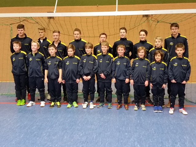 Auf dem Foto präsentieren die F1-Jugend und die C1-Jugend ihre neuen Anzüge. Die Anzüge beinhalten die Vereinfarben des TSV Weeze blau und gelb.